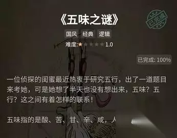 犯罪大师五味之谜答案是什么?《五味之谜》是crimaster犯罪大师谜之解密中的谜题,五味之谜需要玩家解开的谜题是五行图所示的五味顺序,这是一位侦探热衷于五行出的一道题,难度1星,以下是233乐园小编为大家带来的crimaster犯罪大师谜之解密五味之谜答案及解析过程。