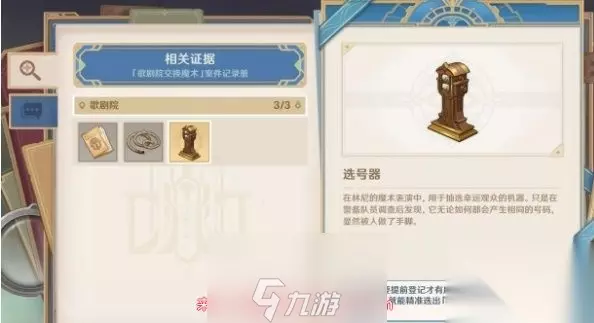 在《原神》中,调查案件线索是解锁剧情和推动任务进展的重要一环。本攻略将详细介绍在歌剧院内调查案件线索的位置和获取方法,帮助你顺利完成任务并解锁更多的故事情节。 原神在歌剧院内调查案件线索三处位置图解 一、调查案件线索位置 在歌剧院内,你需要找到三处线索来调查案件,分别是【选号器】、【魔术表演中的异响】和【歌剧院的出入情况】。 二、获取【选号器】线索 前往舞台,与两名警卫进行对话后,你将获得【选号器】线索。