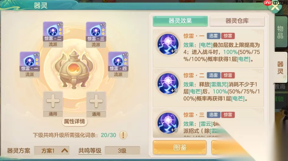 惊雷器灵核心定位: 流派专精:惊雷流派核心输出引擎 核心机制:提升电芒层数上限,加快电芒积攒速度,显著增强雷凰咒爆发威力 战斗节奏:蓄势待发 → 一击定乾坤!通过持续叠加电芒,在能量满溢时释放雷凰咒,打出扭转战局的毁天灭地一击!