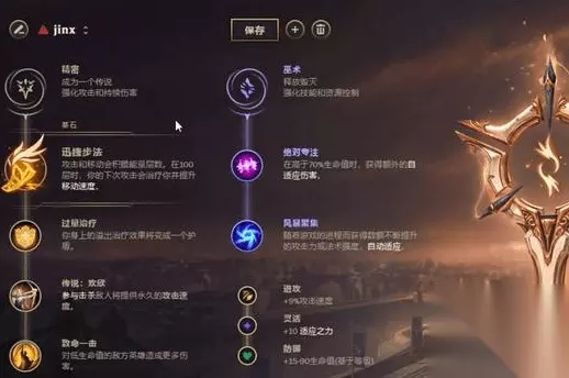 *英雄联盟手游金克丝天赋加点攻略 天赋的选择 金克斯可以选择的天赋比较多,下面就为大家介绍常用的几种。 【迅捷步伐】 因为金克斯的手比较长,可以先A对面一下,然后依靠加速躲掉对面的一些技能,这样可以带来不错的续航能力。 缺点是爆发不足,如果感觉对线难打,并且想要赖线发育,就可以选择这样迅捷。