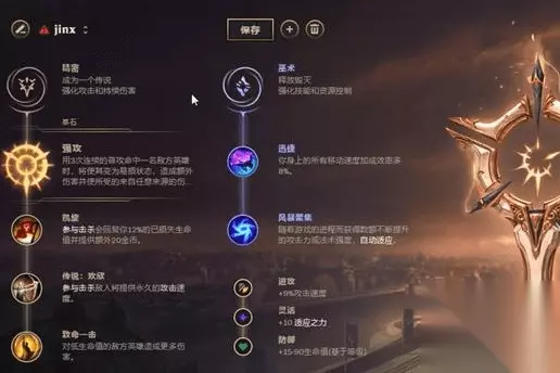 【强攻】 强攻带来的效果是:A三下可以增加伤害。如果线上想快速取得优势,并且辅助能跟上伤害的话,点强攻真的很有用!简单来说,如果你喜欢在线上打架,就要选择这一套天赋! 【致命节奏】 这个天赋可以大幅度增加攻速,配上被金克丝的被动,可以带来不错的效果!在前期对拼的时候,带上这个天赋,对面的ADC根本A不过你。 这是金克斯比较常用的几种天赋,大家要根据对面的英雄来选择不同的天赋,这样才能带来比较好的效果。