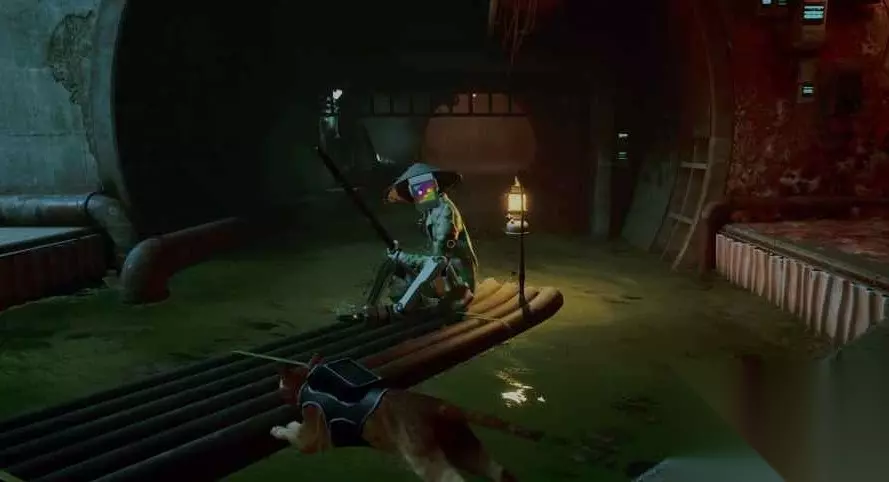《迷失Stray》第八章图文流程通关攻略 沿着小路走到尽头,莫莫正在木筏上等你。跳上去,然后他会开始划进下水道。