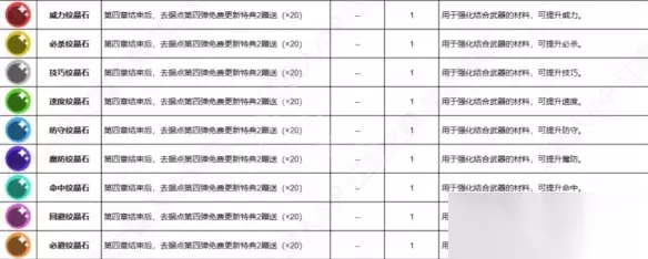 火焰纹章engage中的各类纹晶石都要怎么获取到,可能很多玩家不太清楚。下面小编给大家带来火焰纹章engage纹晶石作用及获取方法,感兴趣的小伙伴一起来了解一下吧。 纹晶石作用及获取方法 纹晶石: 获取方法:第四章结束后,去据点第四弹免费更新特典2赠送(×20)。 1. 威力纹晶石,用于强化结合武器的材料,可提升威力。 2. 必杀纹晶石,用于强化结合武器的材料,可提升必杀。 3. 技巧纹晶石,用于强化结合武器的材料,可提升技巧。 4. 速度纹晶石,用于强化结合武器的材料,可提升速度。 5. 防守纹晶石,用于强化结合武器的材料,可提升防守。 6. 魔防纹晶石,用于强化结合武器的材料,可提升魔防。 7. 命中纹晶石,用于强化结合武器的材料,可提升命中。 8. 回避纹晶石,用于强化结合武器的材料,可提升回避。 9. 必避纹晶石,用于强化结合武器的材料,可提升必避。