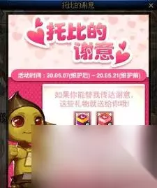 活动持续时间:5月7日维护后~5月21日维护前 这活动似成相识,没错!上次陪托比去冒险了,这次这家伙就来感谢了。 简直胡扯,言归正传,虽然和上次活动有点像,但是,这可是两个完全不一样的活动。 活动玩法: