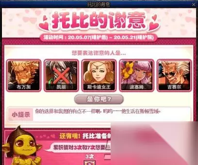 其实玩法很简单,托比需要我们从上图5个NPC中选一个进行猜测,他们分别是,布万加、凯丽、斯卡迪女王、波塞姆、吉赛尔,累计猜中3次和7 次,托比会送给玩家两种不一样的奖励。 猜错则会失去1次机会,可刷2次推荐图重新获得挑战的机会。 猜中3次奖励: