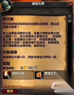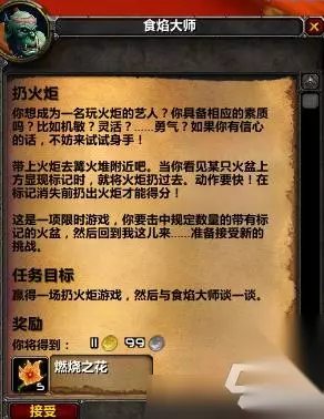 1、扔火炬 在奥格瑞玛智慧谷可以接到任务,限定时间为40秒,需要把靠近篝火堆把火炬扔中火盆,扔中后角色右上角有buff显示,累计到8层即可完成任务。