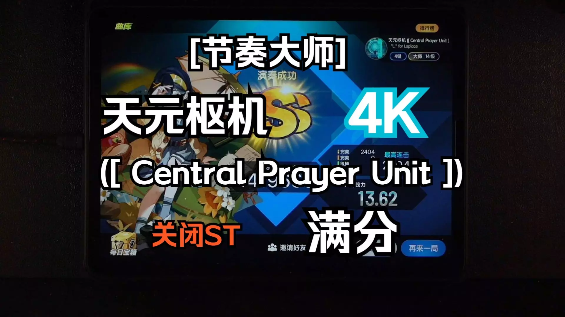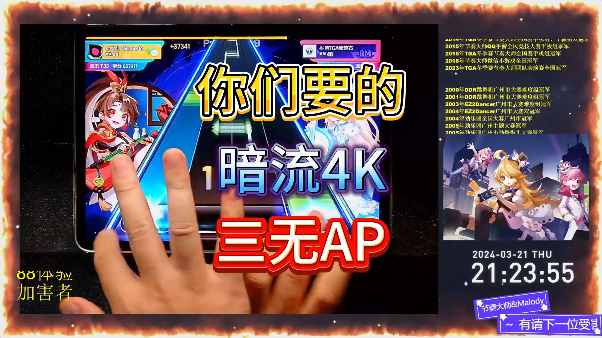 个人定数14+,总算是迎来了经典曲目极限三(Through The Fire And Flames)的回归。 原谱面的难点主要是全程比较扭的折线、结尾的2纵接4纵以及锁手交互,其余部分在底力上去后只是对耐力的考验。 而这次新谱面在4000多combo处加入了一段变速,有很长的高密度双纵,这一段就算不加变速都很难。 也算是圆了之前的梦吧!能够在正式服重新玩到这首曲子。