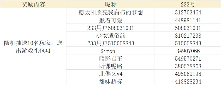 我们将随机抽送10名玩家,送出游戏礼包*1。