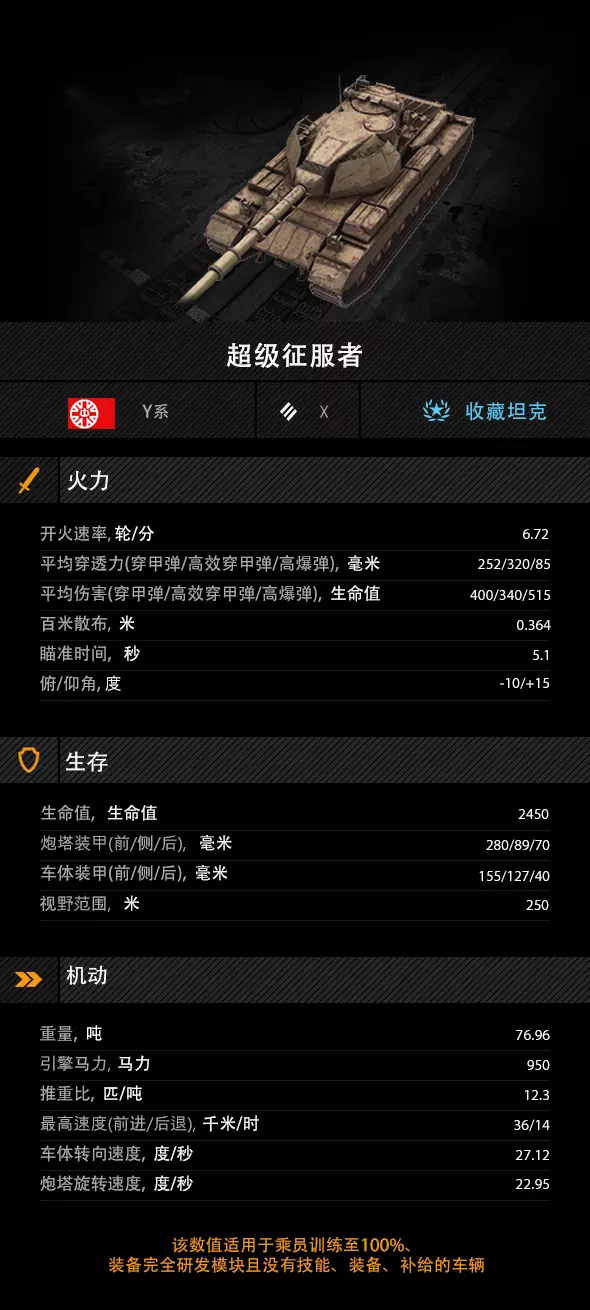 超级征服者是一款集重甲、优秀俯角与可靠火力于一身的全能型重坦。其炮塔防御坚不可摧,配合出色的地形适应能力与稳定的炮控表现,无论是固守要地、推进压制均能扮演关键角色!