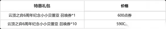 云顶之弈5周年 我是羽饰骑士 小小崔丝塔娜 ●幸运暴击:开启一次十连召唤,必得“幸运暴击”随机云石立减,可用于下一次十连召唤。首次十连召唤时,必得下次召唤立减100云石及以上的“幸运暴击”。 ●额外掉落免费券/半价券:玩家每次进行召唤都有概率额外获得【云顶之弈6周年纪念小小贝蕾亚召唤 免费召唤券*1】或【云顶之弈6周年纪念小小贝蕾亚召唤 半价召唤券*1】。 ●轻食点心:轻食点心可在活动页面中用于投喂【云顶之弈6周年纪念 我是小鲨鱼 小小贝蕾亚】。每投喂一个轻食点心,通过额外暴击召唤【云顶之弈6周年纪念 我是小鲨鱼 小小贝蕾亚】的概率会提升。 ●里程碑:召唤达到指定次数,可领取对应奖励。召唤110次以内(含110次),累积必得1000或以上小鲨鱼徽章(含召唤次数奖励领取)。 ●特惠召唤:活动期间,玩家可付费解锁我是小鲨鱼小小贝蕾亚召唤券礼包(每个礼包单Q单大区限购1次),内容及价格如下: