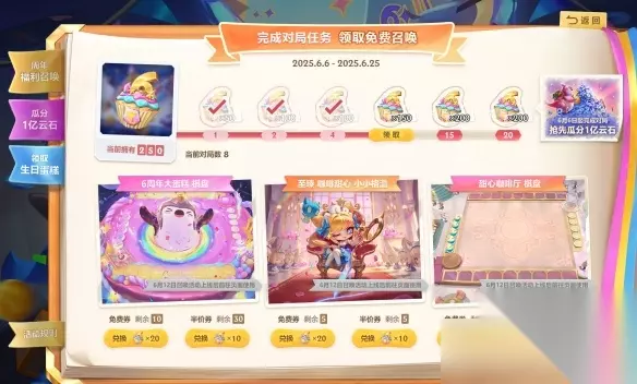 ●活动时间:6月6日-6月25日 ●参与条件:完成云顶之弈对局积攒活动进度,达到对应里程碑后,领取对应的小蛋糕(代币)奖励,并在活动页面完成免费券/半价券的兑换; ●里程碑:
