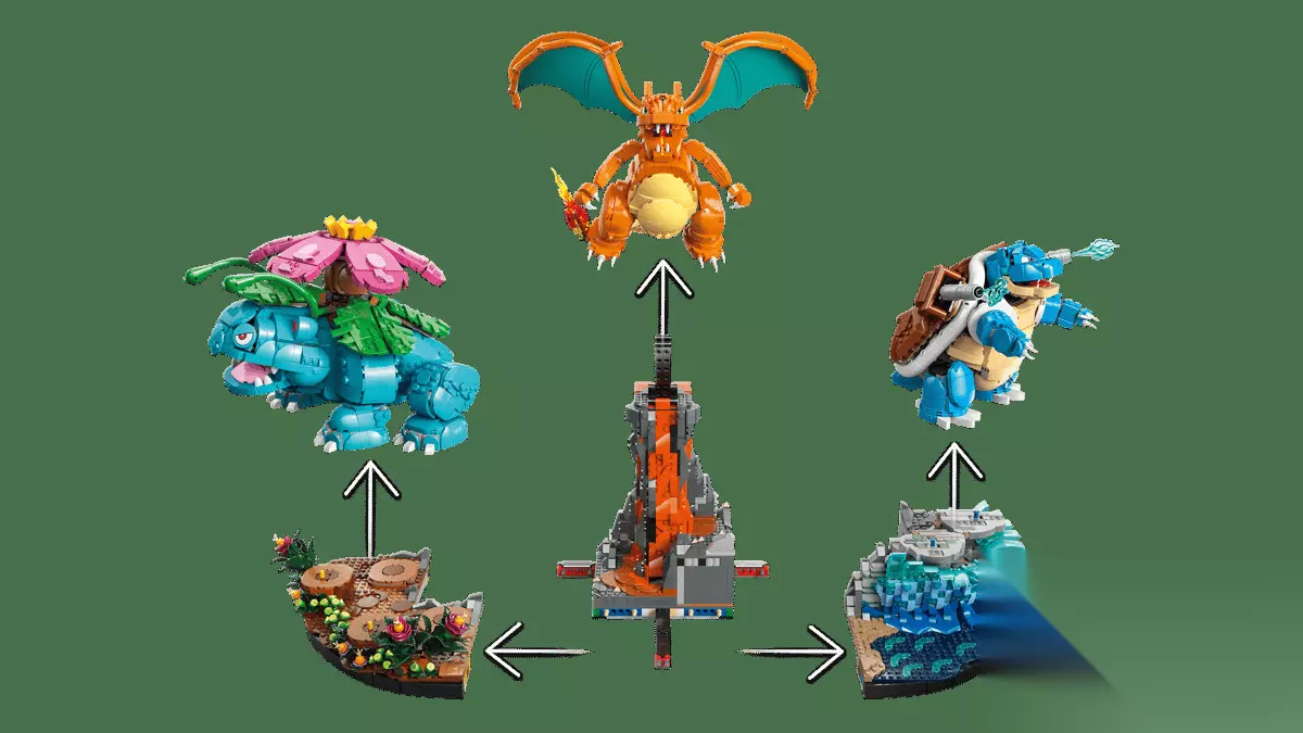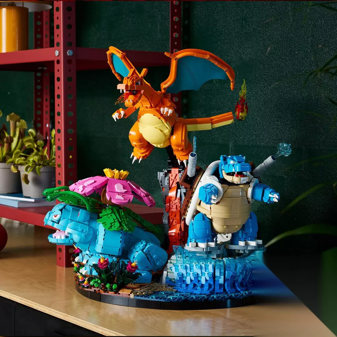 其中的妙蛙花、喷火龙和水箭龟套装包含超过6838个零件,首次以乐高积木的形式展现了关都地区最初伙伴宝可梦的进化形态。他们都忠实还原了原作设计,细节刻画栩栩如生,且各自拥有独特的可动关节。这些宝可梦既可单独展示,也可组合摆放在底座上。底座内藏有彩蛋,等待粉丝在拼搭过程中去发现。底座的设计细节灵感源自每只宝可梦的栖息地,为展示增添了更多层次感。
