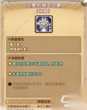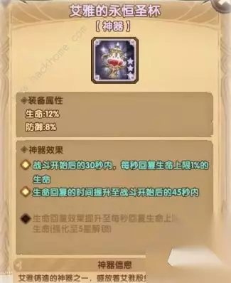 艾雅的永恒圣杯 主坦推荐专用,添加的属性和基质比披风高,也有立即生命回复的效果。特效整体是比较鸡肋的,没有太大作用。主要还是属性还不错。 艾雅的圣灵披风 副坦专用,因为属性添加的比圣杯低,但增加了生命回复的效果。 整体来说,这两个的定位需要活用,基本上坦都是优先使用圣杯。 以下三点范例是圣灵披风生命恢复技能的效果会有所提升: 女妖的吸血和幽魂环绕的效果,都能搭配披风有所提升。 艾雅的威仪之戒 推荐的英雄: 目前这个神器最为契合的就是龙弓了,但是属性也不是特别好。