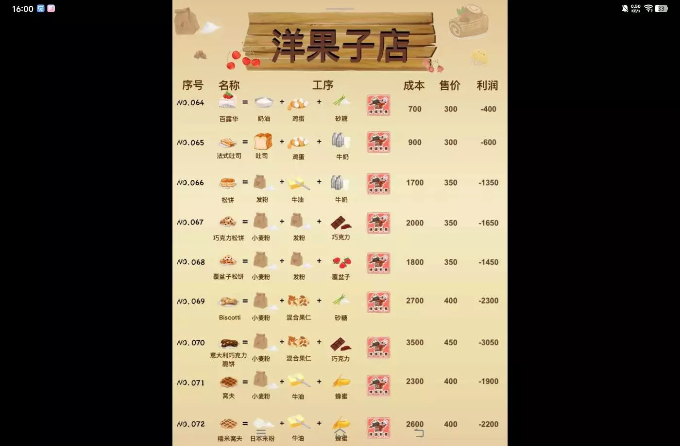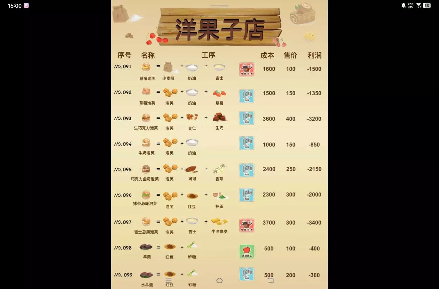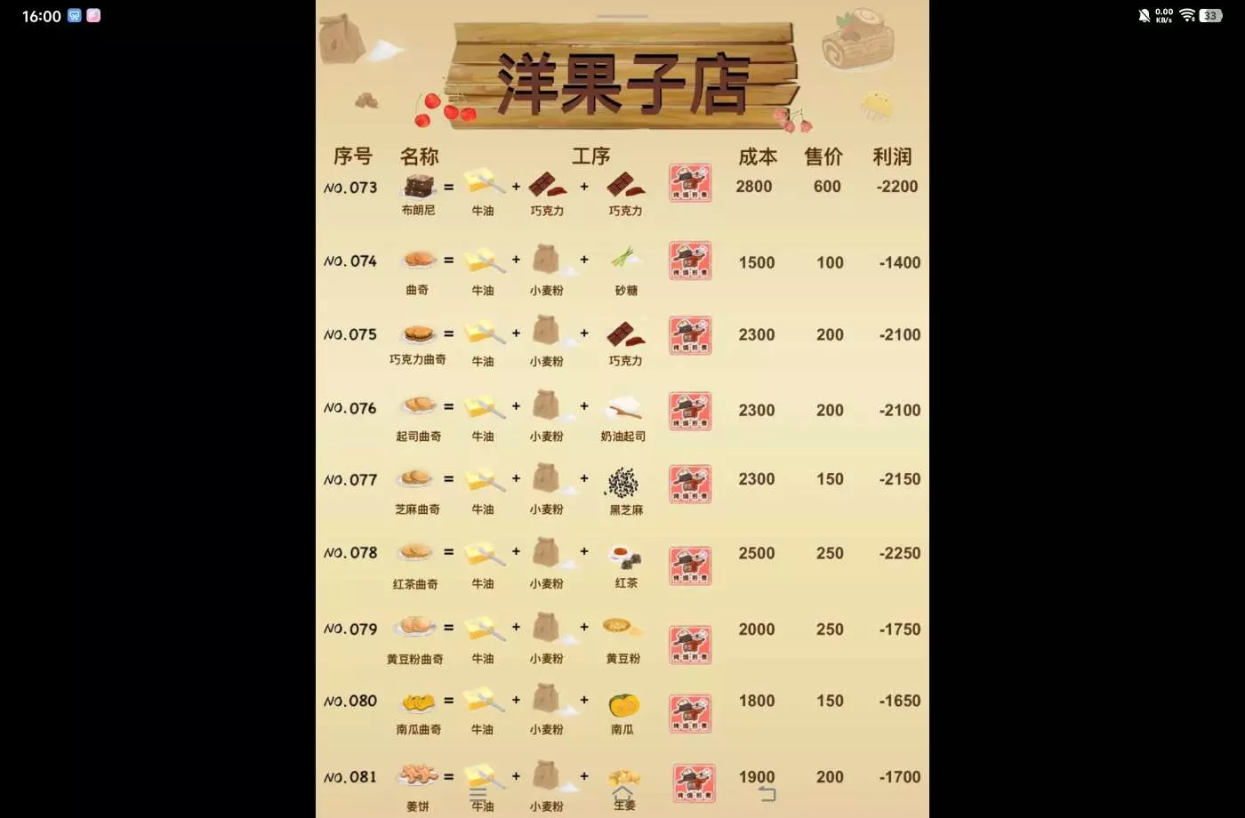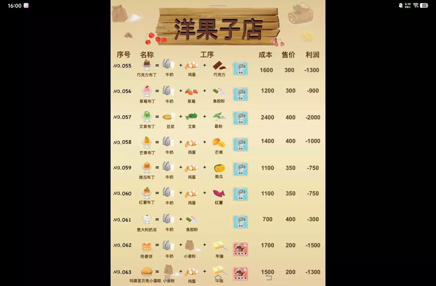 洋果子店部分食谱的成本售价利润
