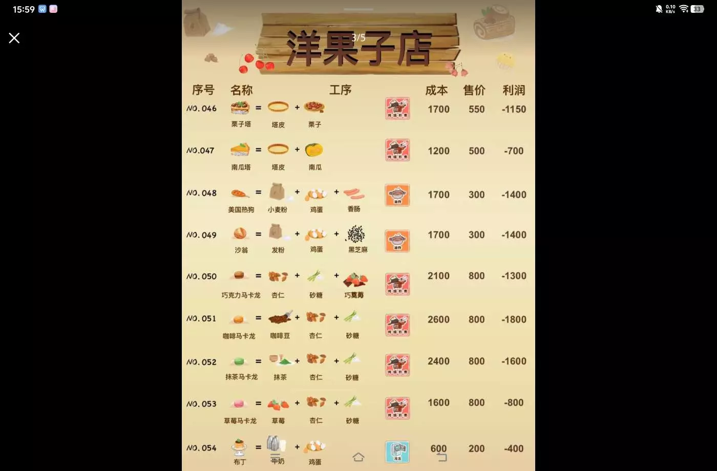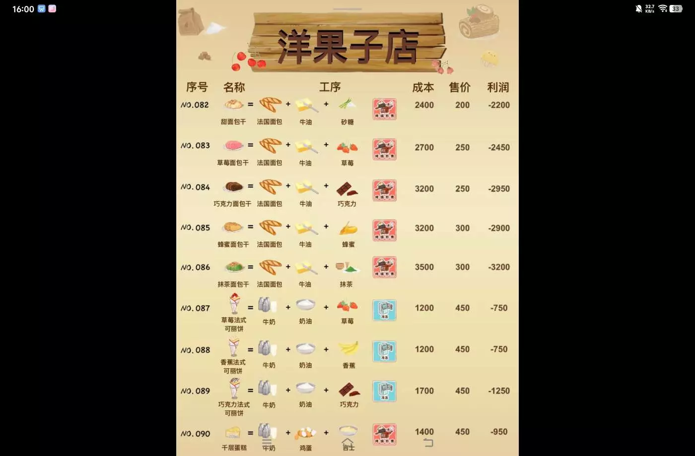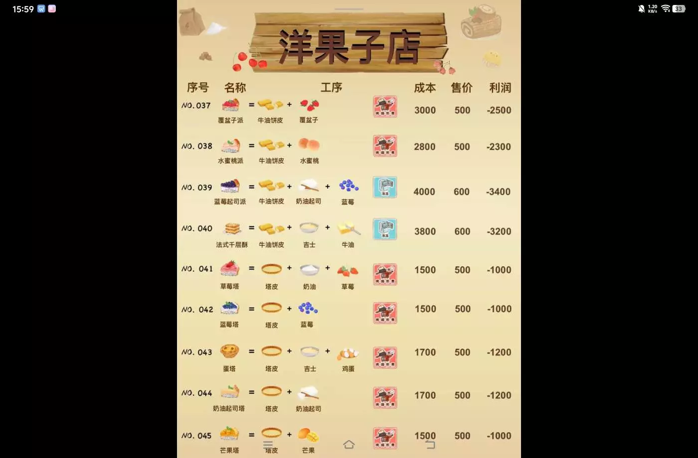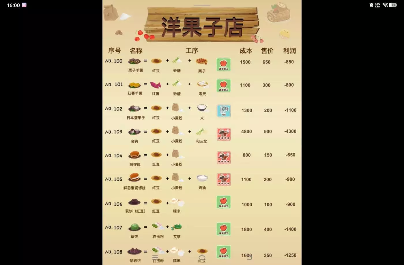 洋果子店部分食谱的成本售价利润