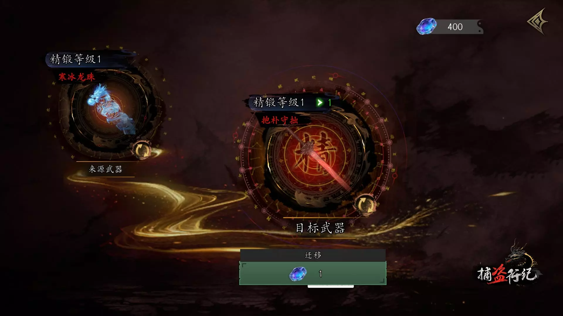 ■对于有多把精锻武器的玩家,在洗剑台处,我们也提供了转移精锻强化等级的功能,可以将一把武器通过精锻获得的等级传授给其他精锻武器。