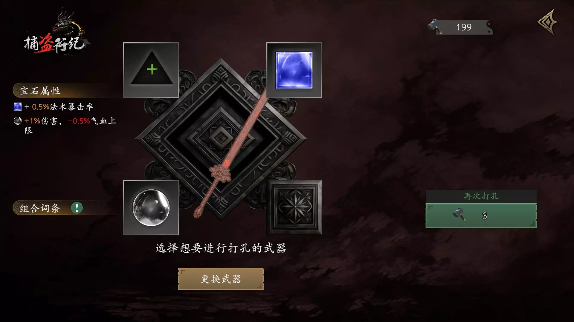 ■洗剑台处可以对武器进行打孔,并将获得的宝石,镶嵌入武器的孔位当中,使武器获得属性提升,不同宝石的组合也将提供不同的效果。