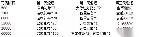 活动二:主角经验双倍 活动详情:活动期间,副本可获得双倍主角经验。 双倍经验不包括英雄卡牌经验 活动三:冲级领礼包 活动期间,玩家达到指定等级,即可领取对应的礼包,礼包内容如下: 等级达到90级以上玩家可领取冲级礼包(大); 等级达到80级以上玩家可领取冲级礼包(中); 等级达到70级以上玩家可领取冲级礼包(小)。 活动四:符石大征收 活动期间,玩家进行符石征收,达到一定次数,将获得对应奖励。 玩家征收50次符石奖励100万金币; 玩家征收100次符石奖励300万金币; 玩家征收300次符石奖励1000万金币; 玩家征收500次符石奖励1亿金币。 注意事项:奖品为累计领取,例如本期活动,征收100次,可领取的奖品为400万金币。 活动五:竞技场争霸 活动详情:活动期间内,竞技场排名前3的玩家获得相应奖励 1:8级符石袋*3 2:8级符石袋*2 3:8级符石袋*1 活动六:神狗献祭 活动期间,玩家在活动大厅可参与神狗献祭,100%稳赚,绝对不赔。 活动七:英雄副本双倍掉落 活动期间,英雄副本所有掉落物品数量翻倍。 活动八:超值兑换 活动详情: 活动期间内,玩家可在活动大厅内进行兑换,详情请留意游戏内活动大厅。 开服第二周 活动一: 充值送豪礼 活动详情:活动期间,玩家通过充值,可获得免费赠送的高价值道具,多冲多送~ 充值满68钻石即可获得MAX宝箱王卡*1 充值满588钻石即可获得勇气宝石*2000 充值满1200钻石即可获得必出五星装备礼包*1 充值满2400钻石即可获得五星融合石*1 充值满7000钻石即可获得五星冒险水晶*3+五星能量石*3 充值满14000钻石即可获得六星英雄进化材料*10 充值满30000钻石即可获得六星万能碎片*1 活动二:推图掉福袋 活动期间,世界冒险可以获得幸运福袋,使用幸运福袋可以获得以下物品: 1~5星能量石、1~5星冒险水晶、少量钻石、金币、小能量药水、小行动力药水、大能量药水、大行动力药水。 活动三:超值兑换 活动详情: 活动期间内,玩家可在活动大厅内进行兑换,详情请留意游戏内活动大厅。 活动四:赏金猎人 活动期间,内击杀普通副本:雪山-16的玩家可获得188W金币(已通关的玩家可以直接领取奖励哦) 活动五:征收得双倍 活动期间内,玩家在主城内进行征收,获得翻倍资源(符石、金币、功勋) 活动六:试炼有好礼 活动期间内,玩家进行任意模式试炼,达到一定次数,即可领取好礼。 任意模式试炼100次将获得英雄石*1000; 任意模式试炼300次将获得英雄石*3000; 任意模式试炼500次将获得英雄石*5000; 任意模式试炼800次将获得英雄石*10000。 注意事项:奖品为累计领取,例如本期活动,试炼300次,可领取的奖品为英雄石4000个。 活动七:英雄经验双倍 活动期间,推图冒险中英雄卡牌经验将双倍获得 开服第三周 活动一:每日充值有豪礼 活动期间内,玩家单笔充值达到588,即可获得58万功勋。每日可完成一次。 活动二:消费有奖 活动期间内,玩家消费钻石(任意方式)达到一定数量,都可领取对应奖励,详情请留意游戏内精彩活动。 活动三:冒险家! 活动期间内,玩家通关任意地图达到一定次数都可领取相应奖励。 通关副本300次即可获得1星冒险水晶*200; 通关副本400次即可获得月亮宝箱*20; 通关副本500次即可获得七级符石袋*1; 通关副本1000次即可获得六星英雄进化材料*5。 注意事项:奖品为累计领取,例如本期活动,通关副本400次,可领取的奖品为:1星冒险水晶*200+月亮宝箱*20。 活动四:超值兑换 活动详情: 活动期间内,玩家可在活动大厅内进行兑换,详情请留意游戏内活动大厅。 活动五:卡牌经验双倍 活动详情:活动期间,副本可获得双倍卡牌经验。 活动六:特殊召唤活动 活动期间,使用特殊召唤礼券,可以参与特殊召唤。特殊召唤位于召唤之门,神之召唤下拉位置。 活动七:英雄副本双倍掉落 活动期间,英雄副本掉落物品将翻倍。 开服第四周 活动一:充值送豪礼 活动期间内,玩家充值钻石达到一定数量 都可领取相应豪礼噢 充值满588钻石钻石即可获得觉醒药水*5 充值满1200钻石钻石即可获得功勋100万 充值满2400钻石钻石即可获得MAX超级装备宝珠卡*5 充值满7000钻石钻石即可获得六星英雄进化材料*8 充值满14000钻石钻石即可获得MAX超级宝箱王卡*20 充值满30000钻石钻石即可获得6星能量石*12+6星冒险水晶*12 充值满60000钻石钻石即可获得6星万能碎片*2 活动二:超值兑换 活动详情: 活动期间内,玩家可在活动大厅内进行兑换,详情请留意游戏内活动大厅。 活动三:充值大返利 活动期间,玩家充值所有钻石可活动返利,返利额度为百分之百,活动期间前3天计算充值数量,后4天进行返利 活动四:培养英雄送钻石 活动期间内,玩家培养英雄,达到一定次数,都可获得相应钻石。具体内容如下: 培养100次可获得68钻; 培养300次可获得200钻; 培养500次可获得300钻。 注意事项:奖励为累计领取,例如本期活动,培养三百次,可获得268钻石。 活动五:功勋大征收 活动期间内,玩家在主城进行功勋征收,达到280次可获得:功勋200万 活动六:登陆送好礼 活动期间,玩家登录游戏,即可获得登录礼包一个。 活动七:人物经验双倍 活动期间,人物经验将双倍获得。