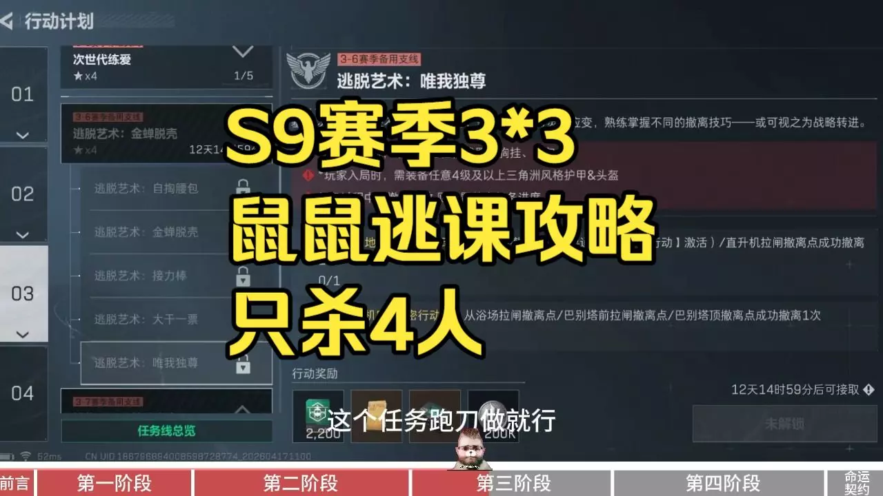 这是《三角洲行动》S9赛季3X3的鼠鼠逃课攻略,适合新手萌新。攻略介绍了任务选择技巧,比如放弃1-1击杀任务,还提及生产物品任务、启明星任务拿箱子等内容,后续还会推出藏宝堆位置介绍视频,帮助玩家快速完成任务。