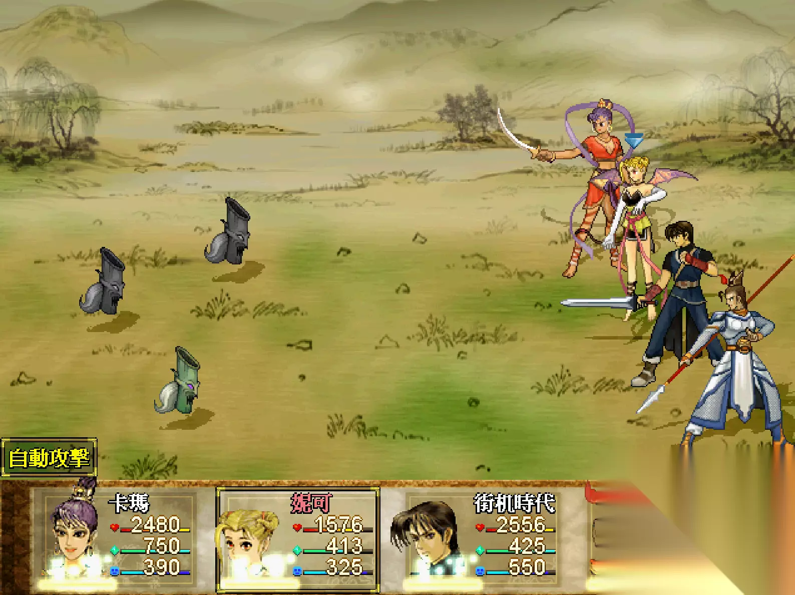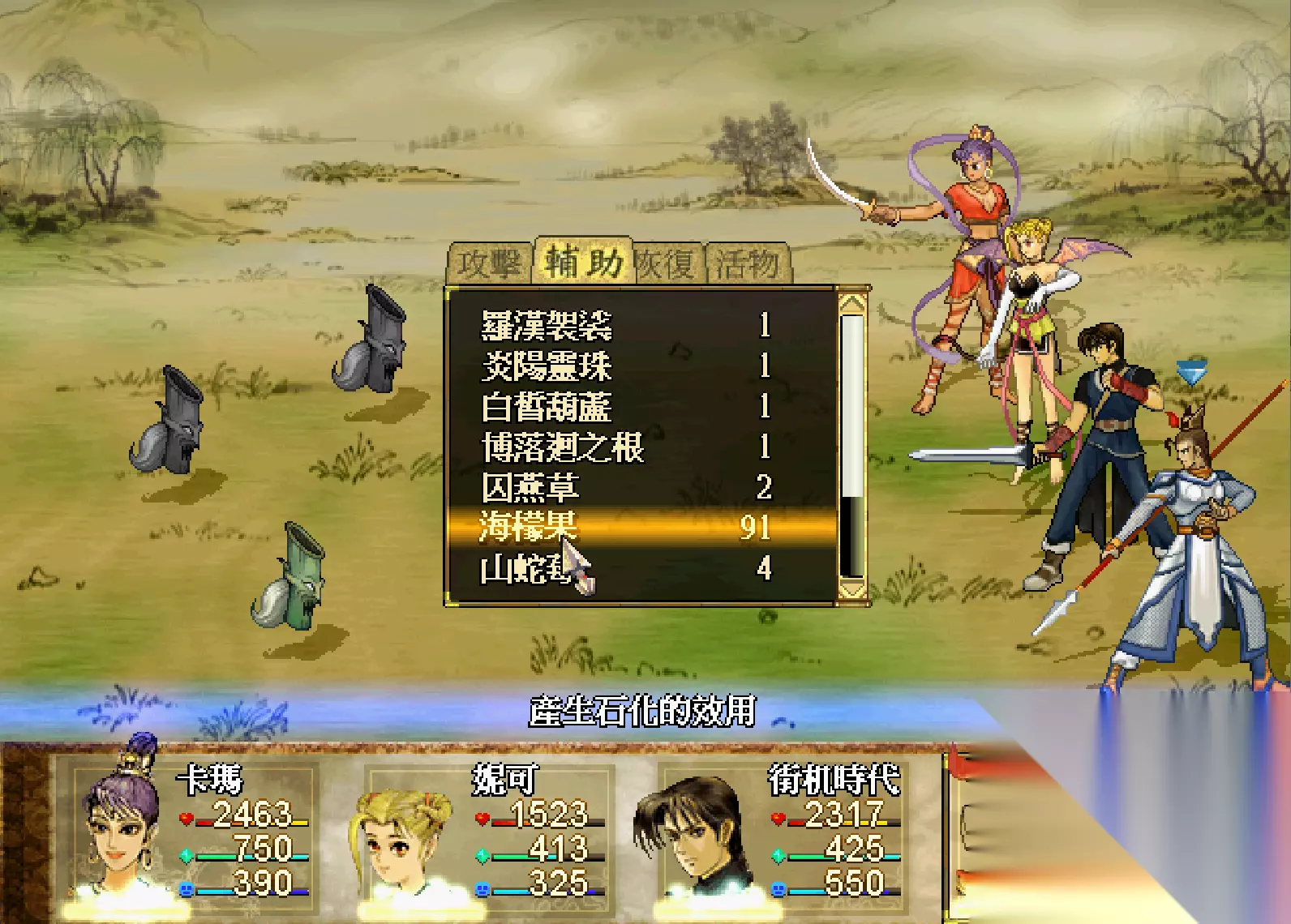 敌人在被石化之后,就失去攻击的能力了,而且石化的时间非常久。几乎不大可能苏醒过来。只要我们剩下一只不石化,那战斗就会一直持续。要是全部石化的话,就直接过关了。 石化之后的敌人,我们无论使用什么攻击方式,伤害都是0。而这就是最佳的练法宝和连熟练度的地方啊!
