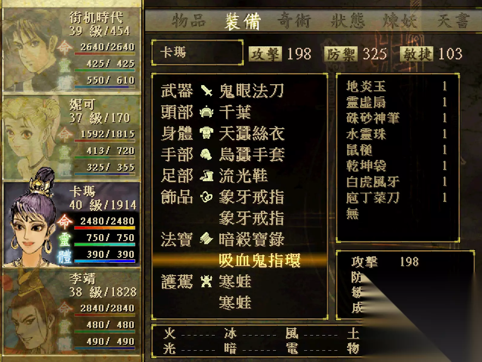 那么问题来了,《轩辕剑3》用什么方式才能最快地练满法宝经验值呢? 这就不得不提到那个BUG般的存在:吸血鬼指环 它的表面效果是:将打出的伤害转换为人物的HP。而实际隐藏的效果就是为其他法宝增加经验值,不过需要一点技巧。 每个角色都可以装备两个法宝,将练经验的法宝放在第一栏,将吸血鬼指环放在第二栏。如下图: