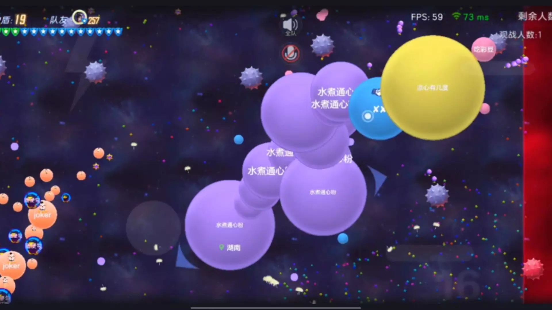 这是《球球大作战》撞车生存模式的游戏内容,玩家“路飞”一局游戏达成200头的超高战绩,疑似开外挂,引发质疑,视频展示了其快速吞噬、其他玩家给其送球的离谱对局过程。