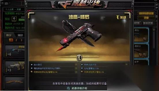 请输入图片描述 弹夹容量:10/50; 增加装备中所有手枪子弹数+1; 同房间玩家经验值增加20%; 同房间玩家GP增加10%; 经验值增加100%; 可使用连续击发:持续按住鼠标左键时,将触发自动连续射击,连续射击时出现特殊连击特效,直到单弹夹子弹全部射完。 接下来介绍的是沙鹰修罗神的属性