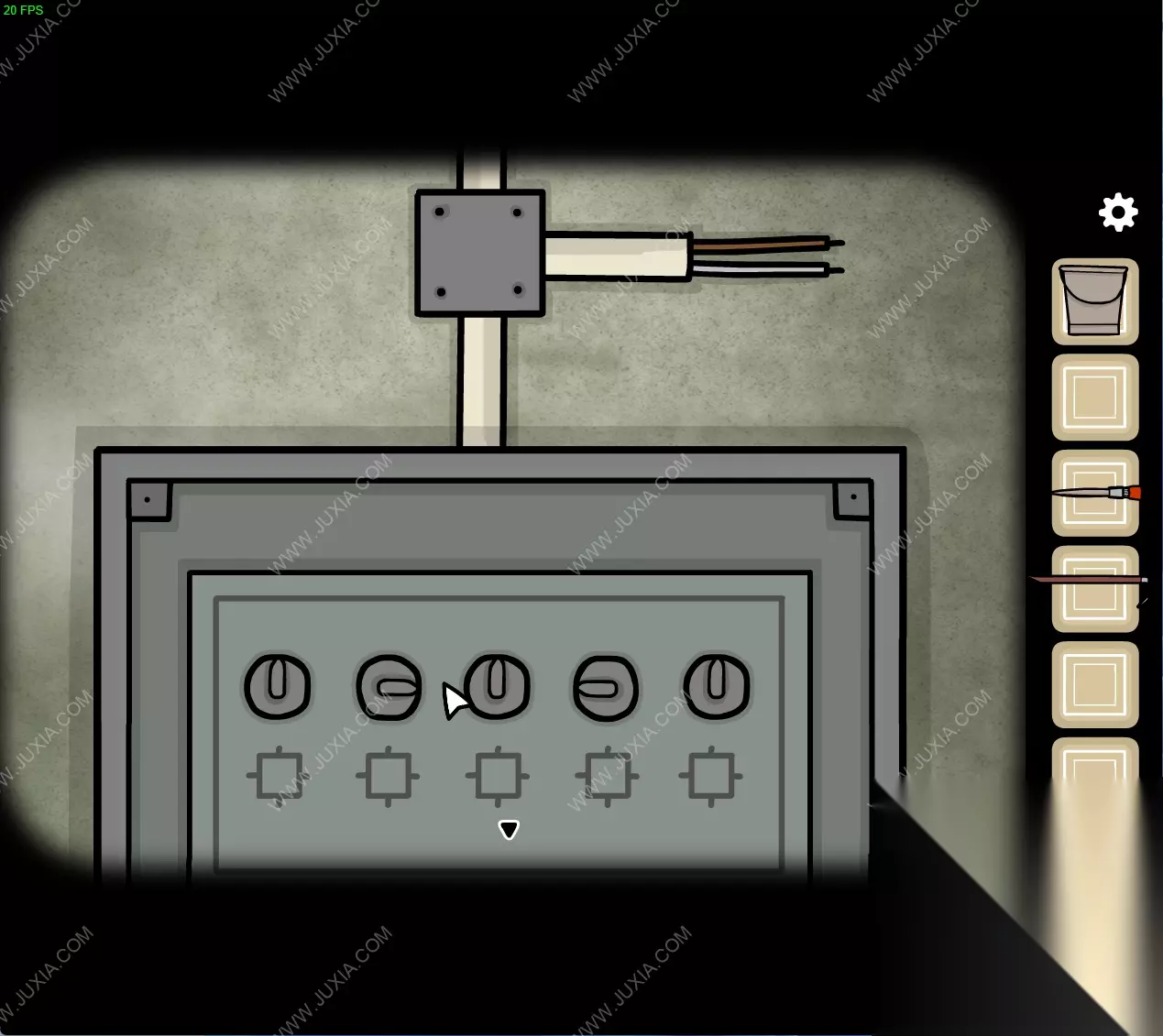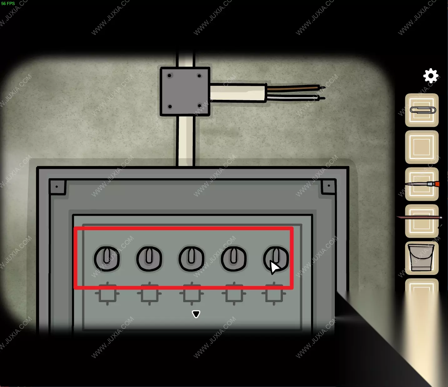 152.回到初始场景,用刚得到的【胶带】将如图电线断开处修复,随后将电箱内的按钮按照如图进行调整。152 152.1