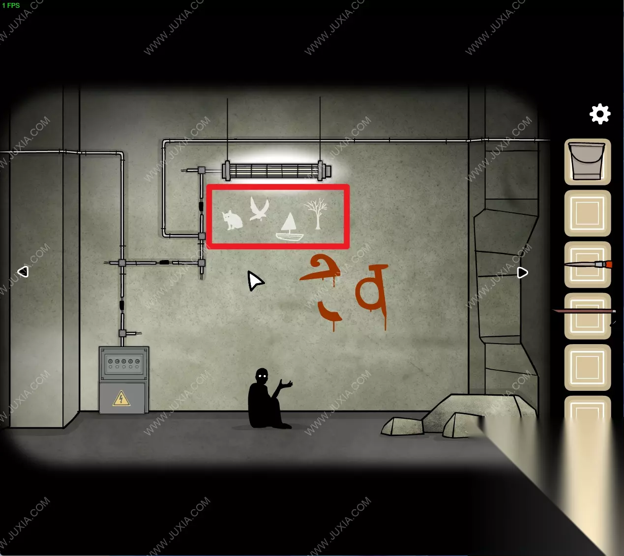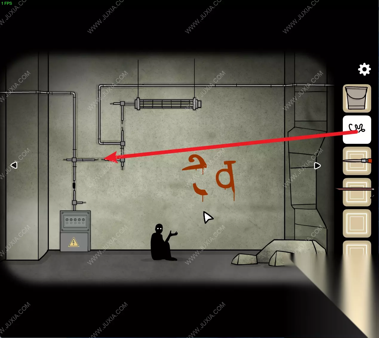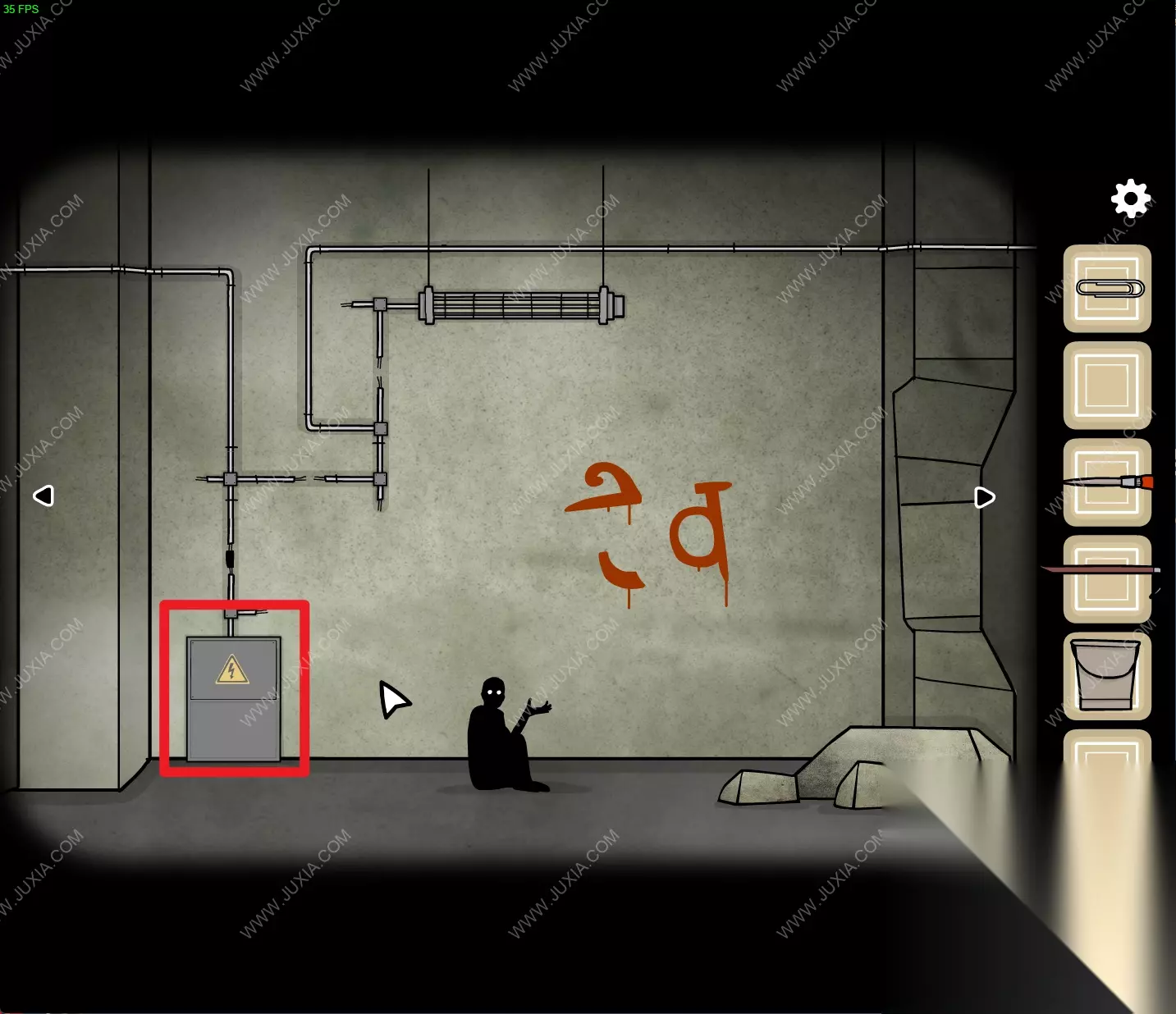 148.回到初始场景,用得到的【铁丝】将如图处断开的电线接在一起,随后将左下角电箱中的按钮如图进行调整。148 148.1