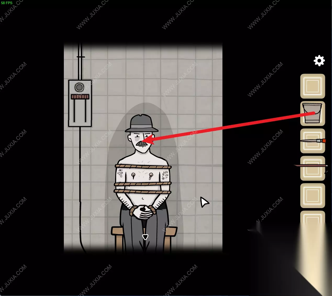 135.来到洞墙场景,用【钳子】将门锁打开,在门中男人的嘴上得到【胶带】。135 135.1