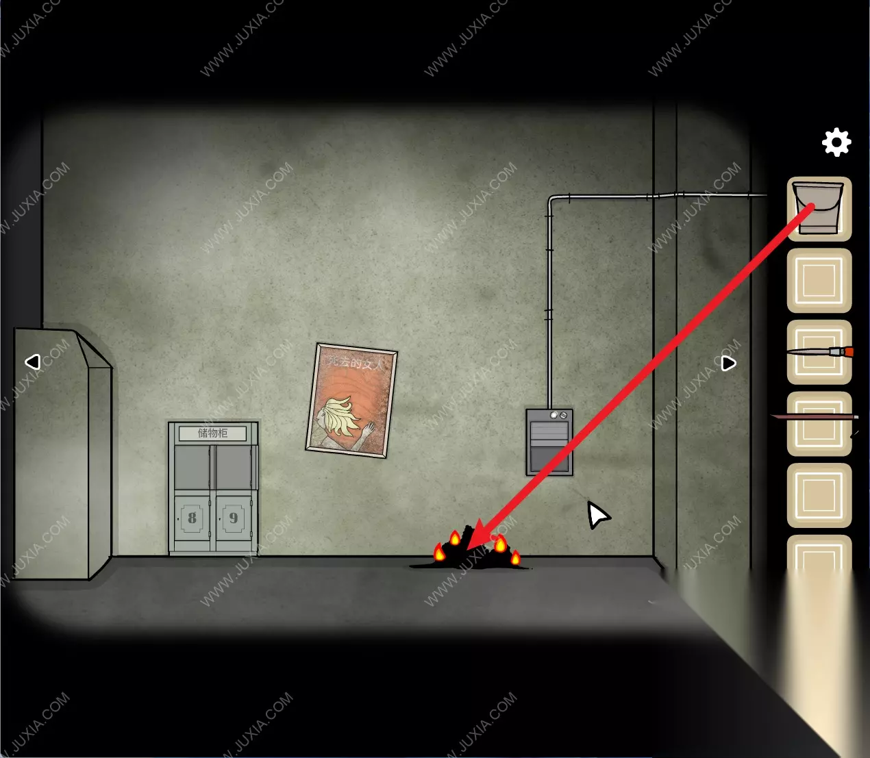 147.再盛一桶水,来到海报场景,用水将场景中的火扑灭,得到【铁丝】。147 147.1