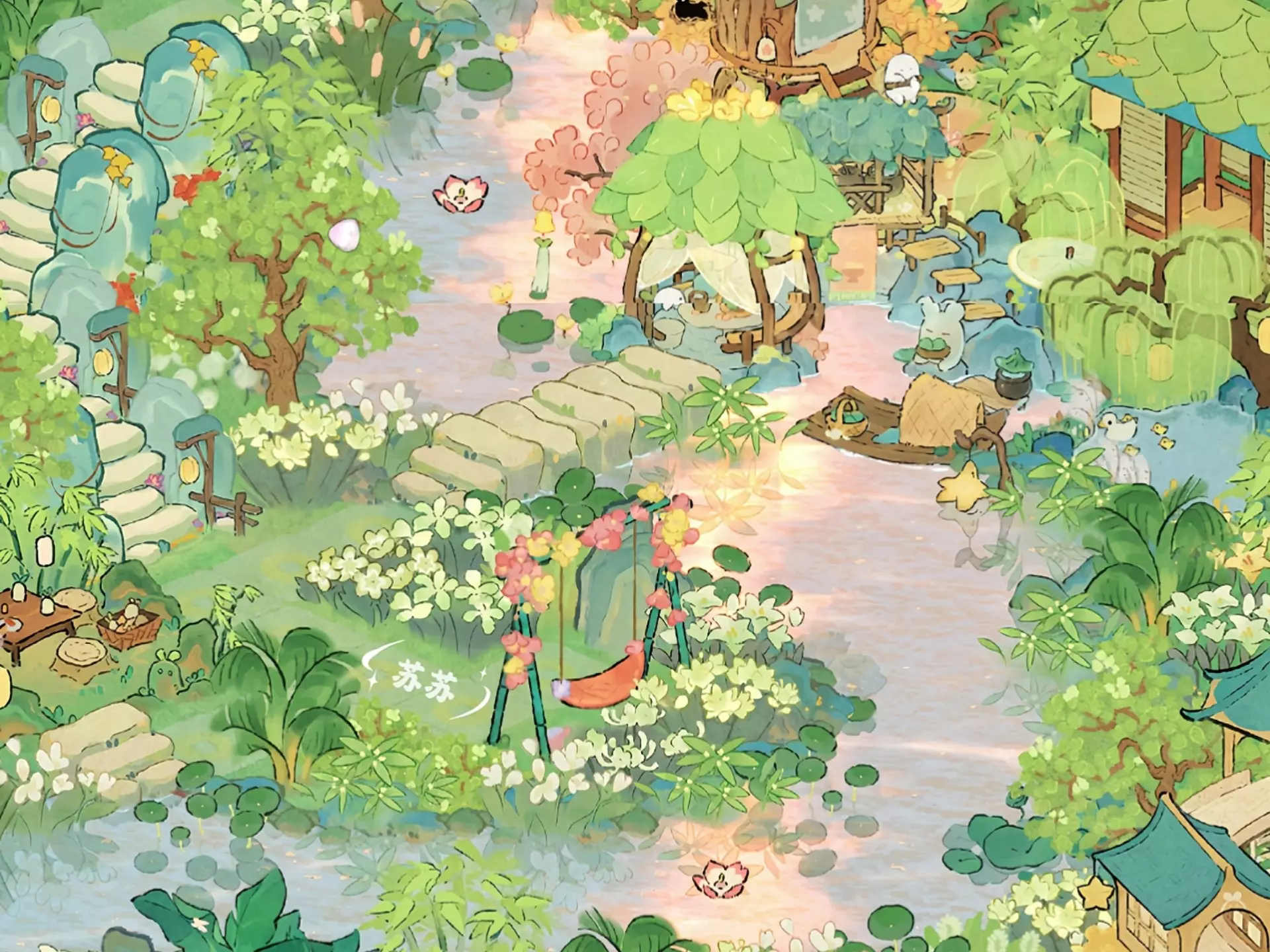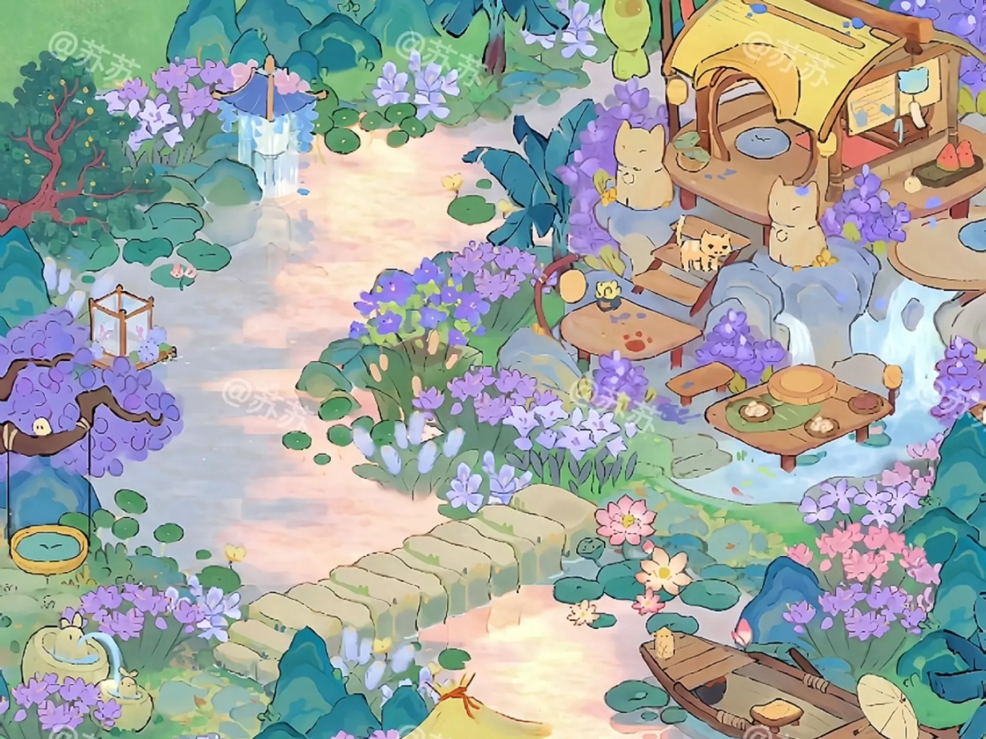 这是《桃源深处有人家》的猫屋一岛布局,整体风格治愈,布局围绕河道打造,搭配猫屋、休闲设施与繁茂花草,呈现出日景和夜景两种治愈效果,充满闲适氛围。