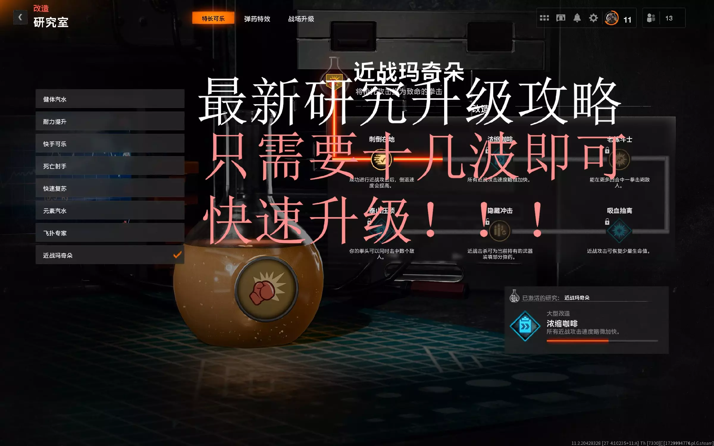 经过测试,每个药水有多个获取研究升级的方式,而只杀僵尸是获得的最少的,要通过其他方式来获取相对应的研究升级经验,比如快手就是要频繁换子弹,抽武器箱和插护甲板,这…