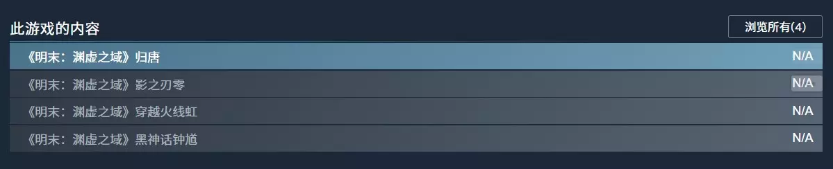 《明末:渊虚之域》未发行开发:authority发行: 505 authoritysteam页面显示【此游戏的内容】《明末:渊虚之域》归唐《明末:渊虚之域》影之刃零《明末:渊虚之域》穿越火线虹《明末:渊虚之域》黑神话钟馗