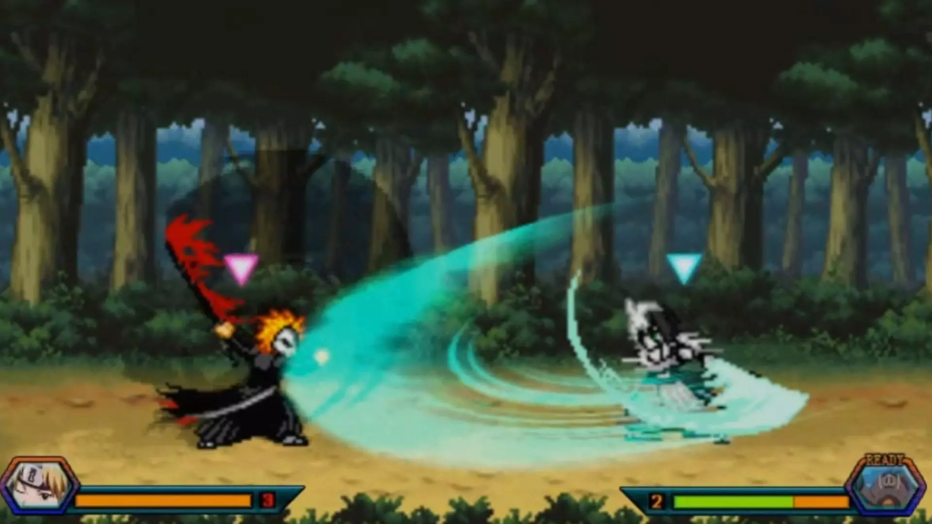 这是《死神》相关的跨界格斗游戏内容,展示了包含死神、火影等动漫角色的选人界面,以及更木剑八、黑崎一护等角色的对战画面,呈现了精彩的格斗对战场景。