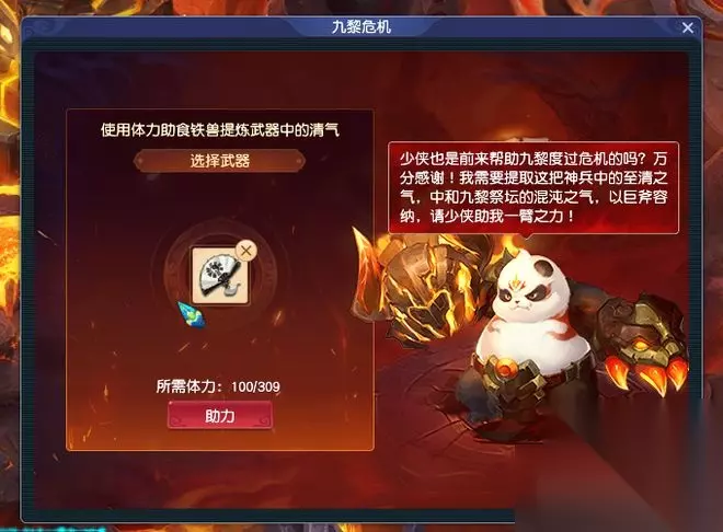 找到食铁兽后,你需要选择九黎危机进入活动界面,将准备好的武器放置到指定位置,点击助力即可。不过,这里的助力会消耗体力,每消耗100点体力就可以获得7500两金钱,整体收益和书店打工差距不大。 另外,提供助力的武器是不会被消耗的,所以即便你没有闲置的光武,也可以拿手上的光武进行助力。
