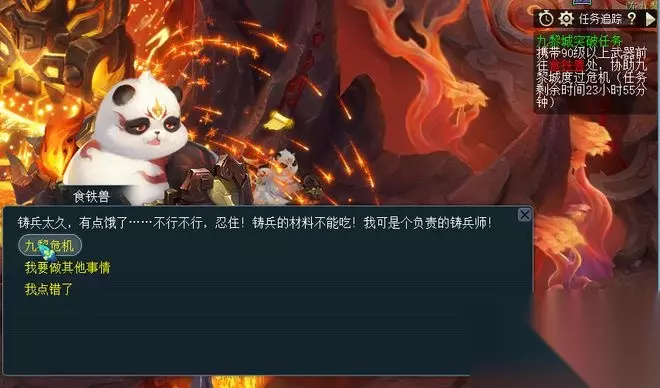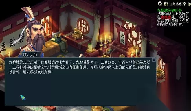 接到该任务后,师傅会告诉你九黎城的祭坛已经压制不住混沌力量了,如果失守就会让三界面临危机。不过,九黎城的食铁兽发现光武中的至清之气可以压制魔域之力,所以你需要携带90级以上的武器前往九黎城食铁兽处,帮助九黎城渡过危机。 二、食铁兽处提取武器清气,提供助力的武器不被消耗