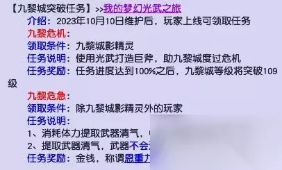 2023年10月10日星期二维护后,每个门派的小伙伴都在可以通过同门派师傅对话的方式,接取“九黎危急”任务。