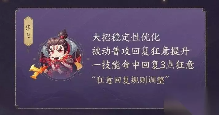2、张飞 大招稳定性优化,被动普攻回复狂意提升,一技能命中回复3点狂意,狂意回复规则调整。