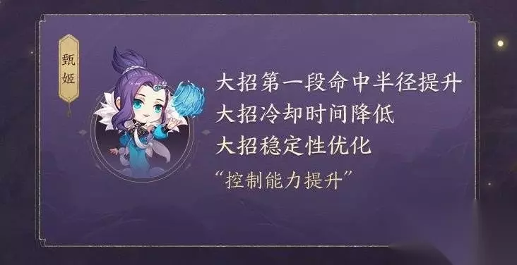 《王者荣耀》五位英雄调整介绍 1、甄姬 大招第一段命中半径提升,大招冷却时间降低,大招稳定性优化,控制能力提升。
