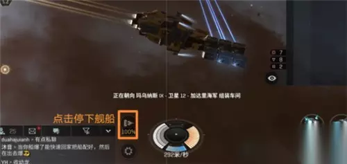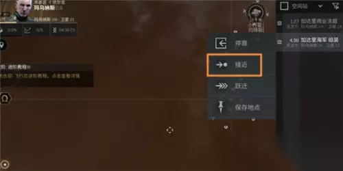 选定好挖矿位置后要调整好朝向,舰船的方向要和逃跑的方向一致,因为跃迁分为转向→加速→跃迁这三个步骤,提前转向能更快跃迁提高存活率。点击接近回到自己的空间站,并且停下舰船。