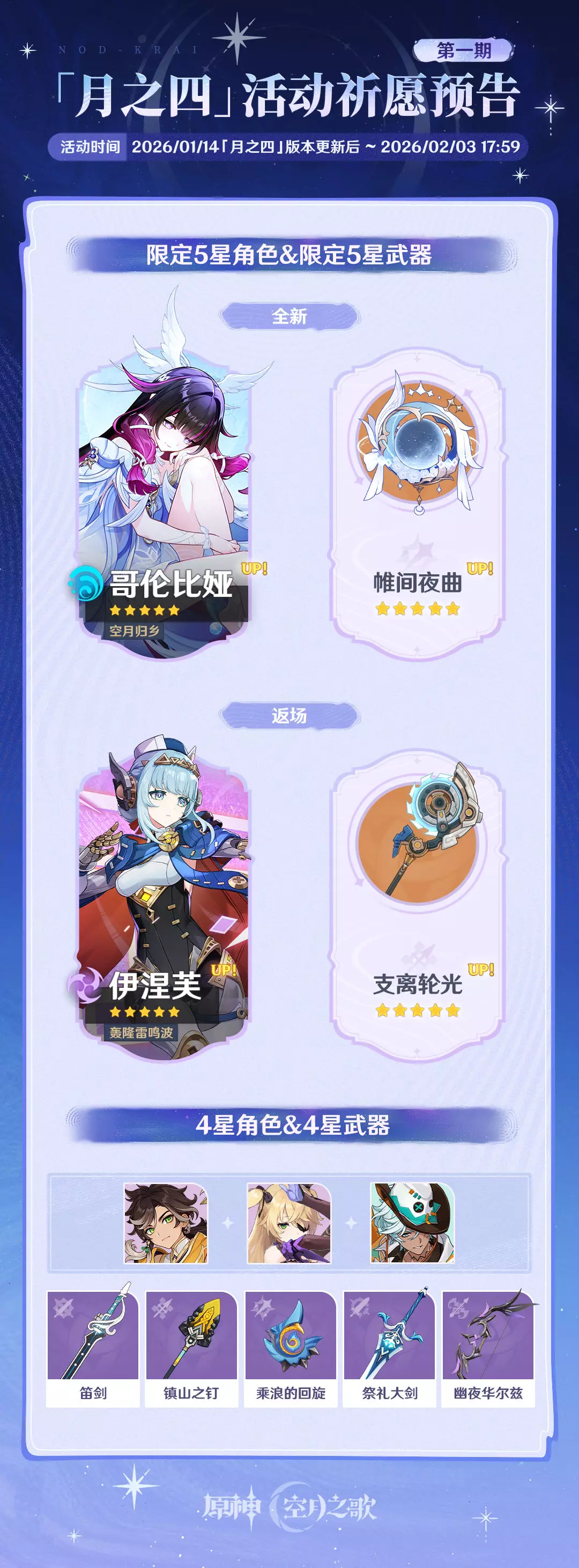 本期活动祈愿时间为2026/01/14 「月之四」版本更新后 ~ 2026/02/03 17:59。
