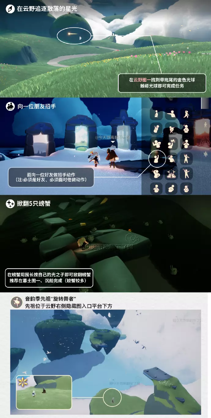 《光遇》游戏中每天的每日任务及大蜡烛的位置都不相同,玩家完成每日任务及收集大蜡烛都可以得到丰厚的兑换奖励,奖励可以用于兑换各种动作及道具,不过很多小伙伴不知道每日任务怎么做,又懒得自己去找大蜡烛的位置,我们汇总了每日任务的完成攻略以及蜡烛位置,一起来看看吧!