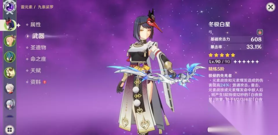 2. 天赋升级(核心技能拉满,普攻放弃) 九条的辅助能力全靠元素战技,元素爆发仅作为补充增伤和回能,普攻完全用不到,天赋升级优先级:元素战技(E)>元素爆发(Q)>普通攻击(A),具体建议: - 元素战技(核心):优先拉至9级(有智识之冕可拉10级),等级越高,增攻比例越高,10级元素战技增攻比例可达77.33%,是九条的核心辅助技能,值得投入天赋书和素材; - 元素爆发:拉至6-8级即可,主要作用是补充雷元素伤害和团队增伤,等级提升收益不高,无需刻意拉满; - 普通攻击:无需升级,九条全程作为辅助,基本用不到普攻,投入资源纯浪费。 天赋升级素材:优先收集“风雅”系列天赋书(周三、周六、周日刷取),搭配面具系列和灰烬之心(雷电将军周本掉落),按优先级投入即可。 二、核心搭配:武器与圣遗物(精准堆属性,不浪费词条) 九条的武器和圣遗物选择,核心围绕“提升基础攻击力+元素充能效率”,无需追求5星,平民武器和圣遗物也能发挥奇效,具体推荐分梯度,新手可按需选择: 1. 武器推荐(分梯度,优先白字高+充能)