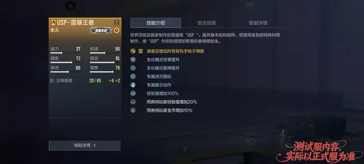 “USP-雷暴王者”的技能加强在生化方面,分别是生化模式伤害提升与生化模式载弹提升,让这把武器在生化模式中拥有不俗的输出能力与续航能力。