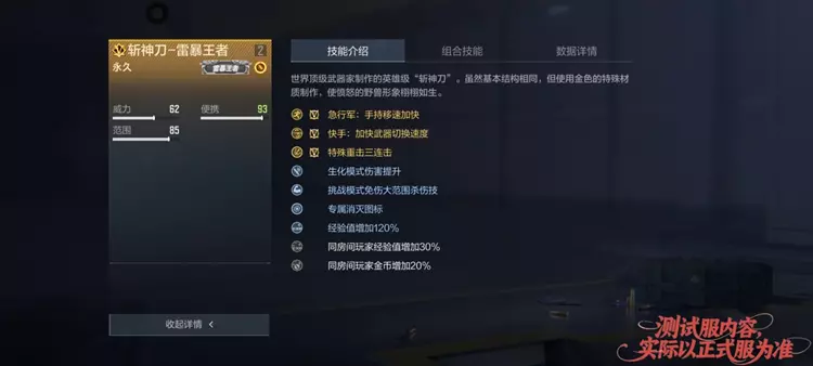 “斩神刀-雷暴王者”的技能除了英雄级近战武器的“快手、急行军”外,还拥有生化模式伤害提升、特殊重击三连击与挑战模式免伤大范围杀伤技。