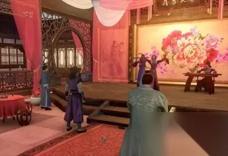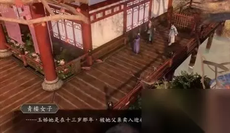 9、接下来自由移动期间,需要找到左边这个紫色衣服的青楼女子,交互之后她会带我们到一个清净点的地方讲述那个自杀女子的故事。