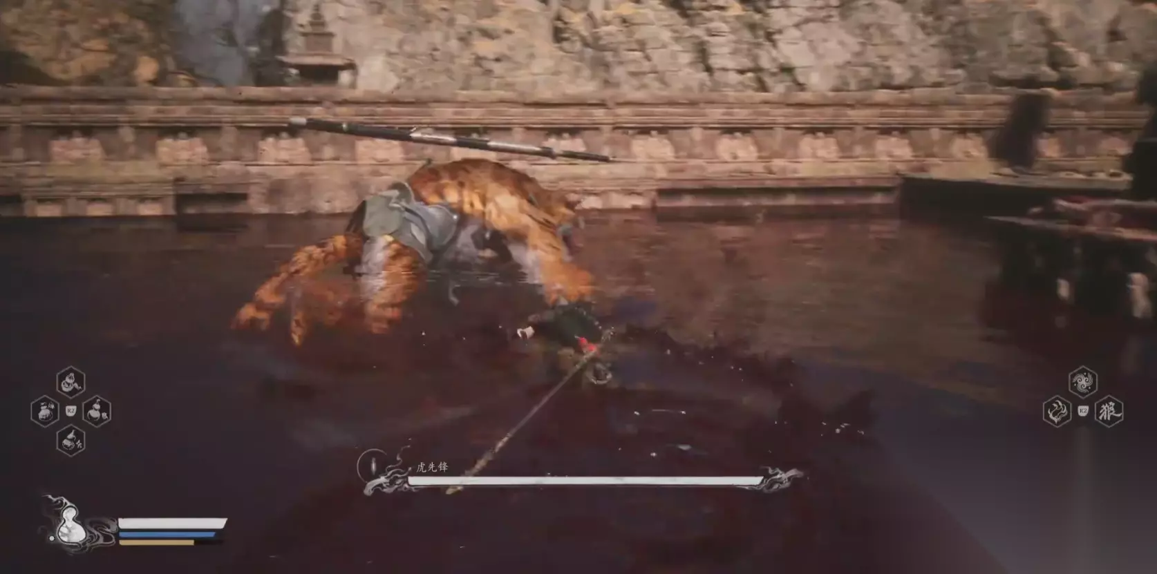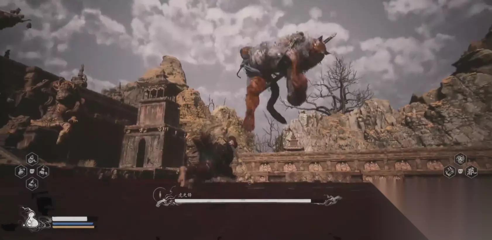四、虎先锋 这也是很多劝退了很多玩家的一个头目,一头两脚站立,背后背着宝剑的吊睛白额虎,他的攻击手段主要是原地蓄力猛扑,抽剑瞬移释放剑气,跑远之后使用长剑卷起血龙卷以及化作石头以后突然从侧面窜出,这几种招式的起手式都非常明显而且没有命中也会有很长的后摇,只要能辨别并且第一时间作出反应就能打败他。