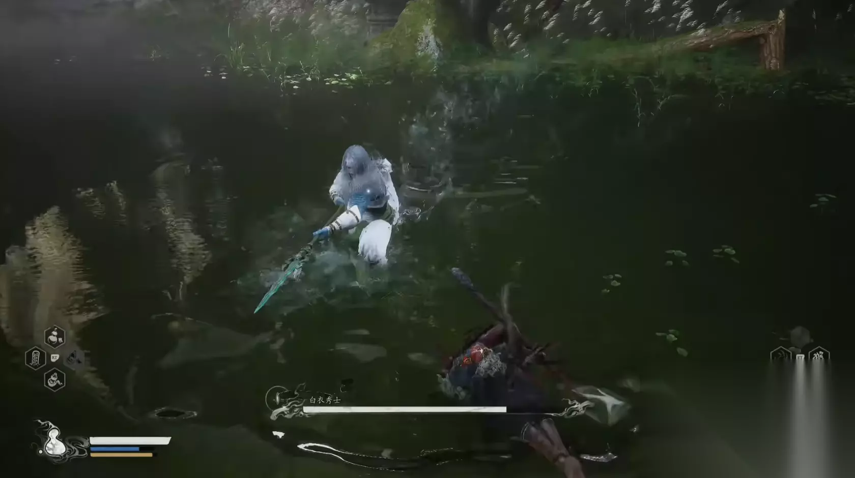 二、白衣秀士 蛇精妖王,也是诸多同类中比较难缠的一个角色,使用一把长枪,一阶段是白衣男子的形态,二阶段腿会变成修长的蛇尾,这个boss的难点就在于非常灵活而且招式多变,他的大部分技能在结束以后都会再附带一次追击效果,一阶段的主要攻击方式就是短暂蓄力后的三连、四连接突刺,或者接一次原地蓄力然后半圆范围内的超强轰击,对付这些招式的关键一个就是闪,万事不决先闪为敬,等其招式后摇再去抓,或者用定身咒打断以后再输出。
