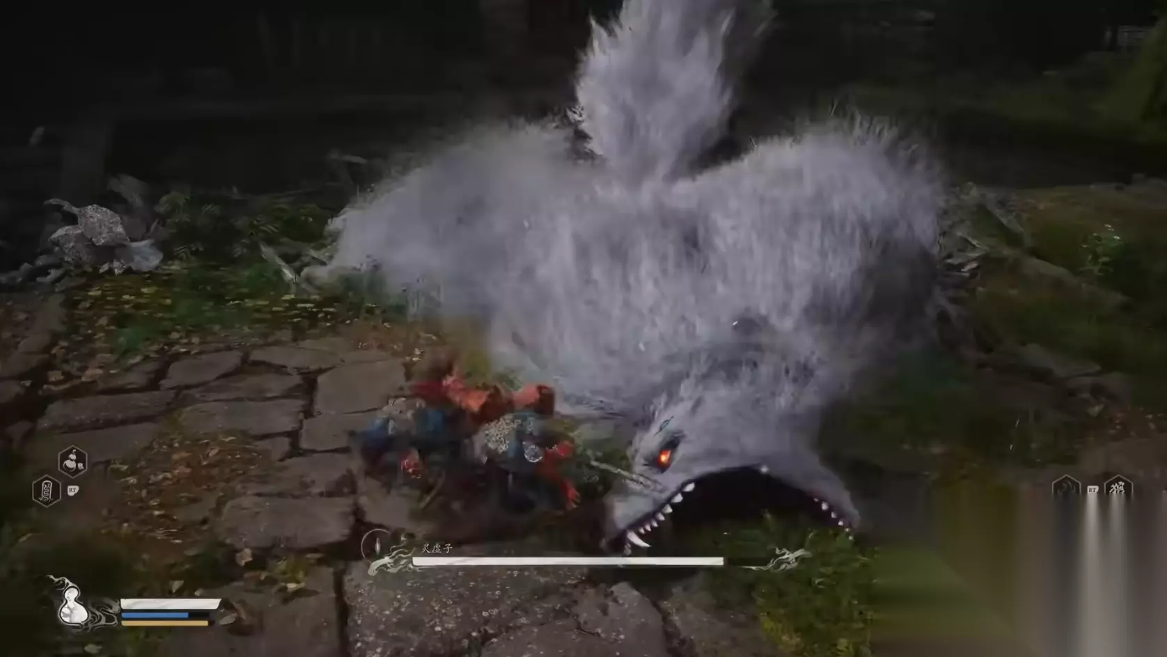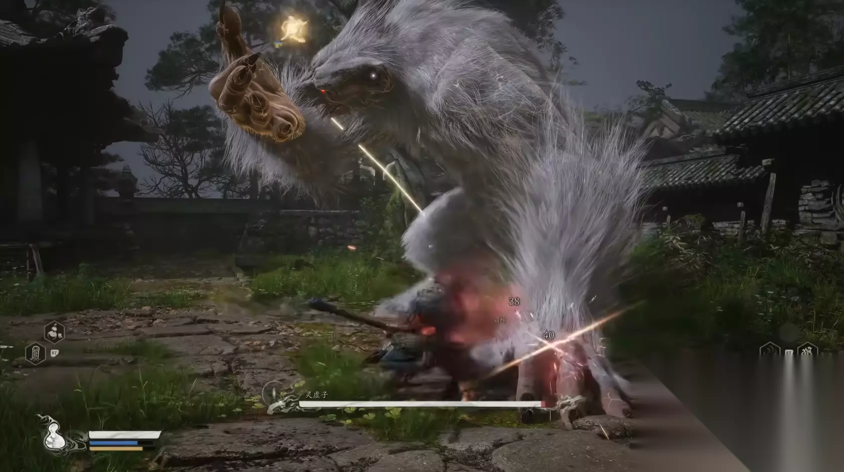 一、灵虚子 这是第一个大家会见到的妖王,也是一个造型非常帅气的怪物,它的外形是一个巨大的白狼,矫健并且凶猛,它的主要攻击方式有抓、咬、扑这三种,刚开局他就会从房顶上飞扑下来,需要大家闪避才可以躲开,在把它打到50%血量的时候它会跑到房顶再来一次这个技能,需要把握时机躲开不然是必死技能。当看到狼头横过来的时候就代表它要使用咬技了,闪避或者替身术都可以躲开这个攻击,之后他会接一次左右双抓,记得要躲两次这个技能。